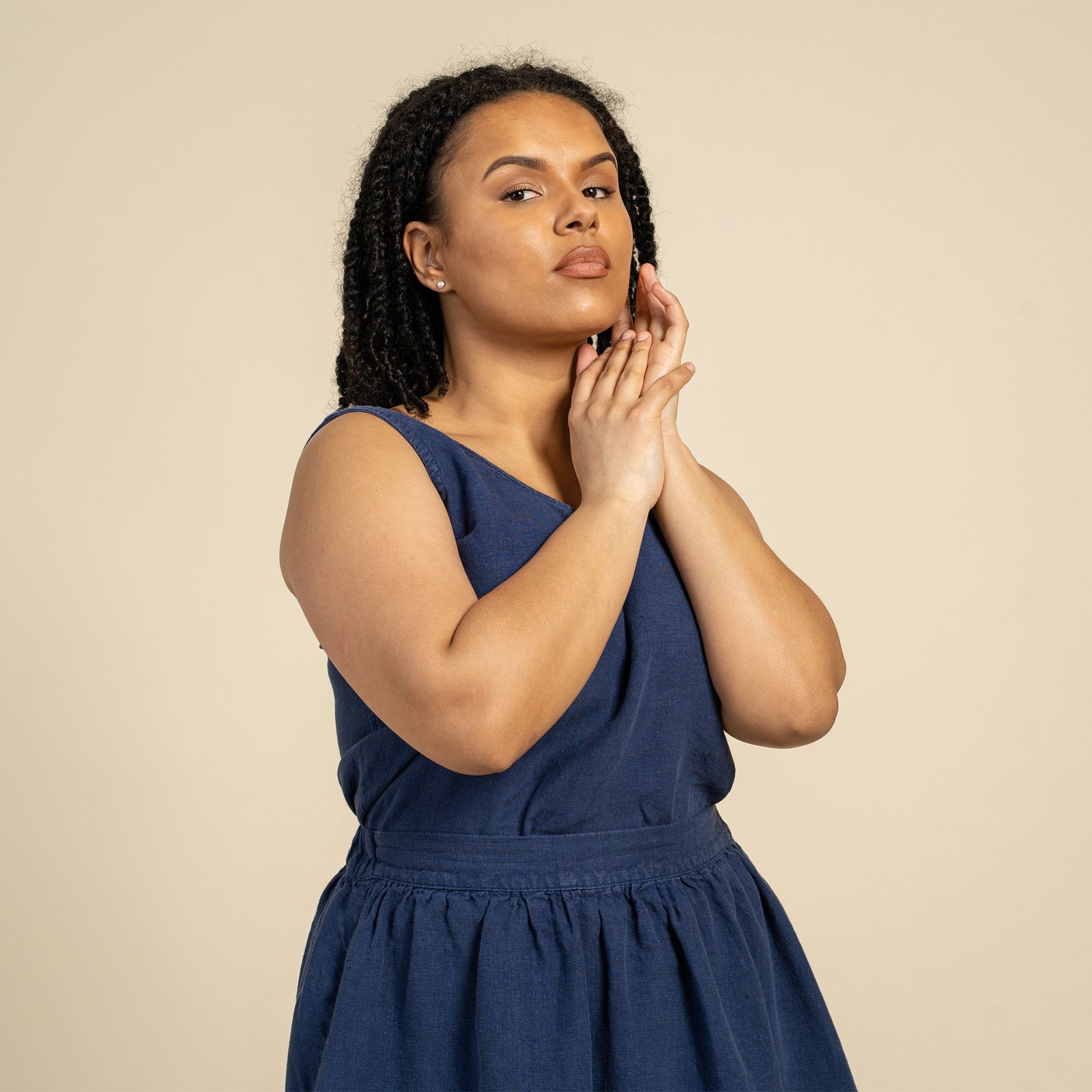 Hana tank top sits neatly across the shoulders and has a relaxed fit, not too loose or oversized. Please note, the garment naturally softens and relaxes as you wear it throughout the day. It'll become more comfortable as you move around in it.